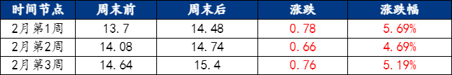 第一波明显提涨节点是元宵节,湖南均价高点14.48元/公斤,较2月3日上涨0.78元/公斤,涨幅5.69%;第二波明显涨幅是2月的第二个周末,主要基于分割入库的基础,叠加二次育肥开始进场,湖南第二波均价高点14.74元/公斤,较2月10日上涨0.66元/公斤,涨幅4.69%;目前猪价处于第三波明显上涨中,均价高点15.40元/公斤,周末上涨0.76元/公斤,周日大概率止涨窄幅调整。综合来看,利多主力军仍然是二育户的陆续进场,辅助拉涨因素收储消息和期货拉涨,屠宰端消化能力仍有限。