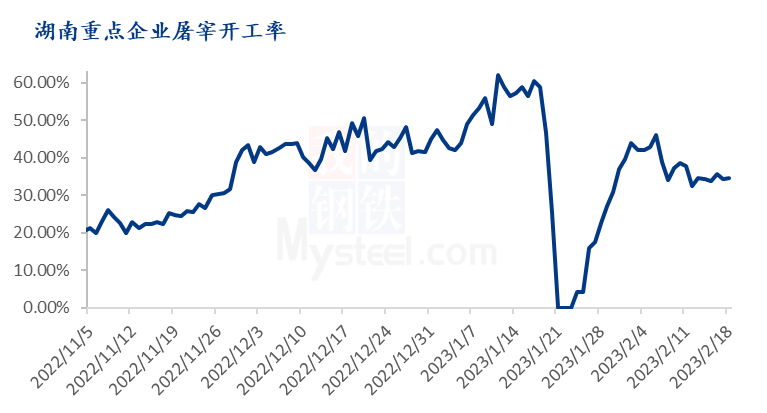 如图所示,近期湖南重点企业屠宰开工率维持稳定,目前样本开工率维持在34.5%左右,较2月初的43%,下降8.5%,随着猪价的不断上探,屠宰分割入库热情下降,湖南屠宰分割占比10%-35%不等,企业根据自身发展情况,分割入库比例不尽相同,综合来看,湖南地销订单表现一般,居民仍以消化年前囤的腊肉和生鲜为主,从屠宰端来看,猪价继续上涨动力较弱。