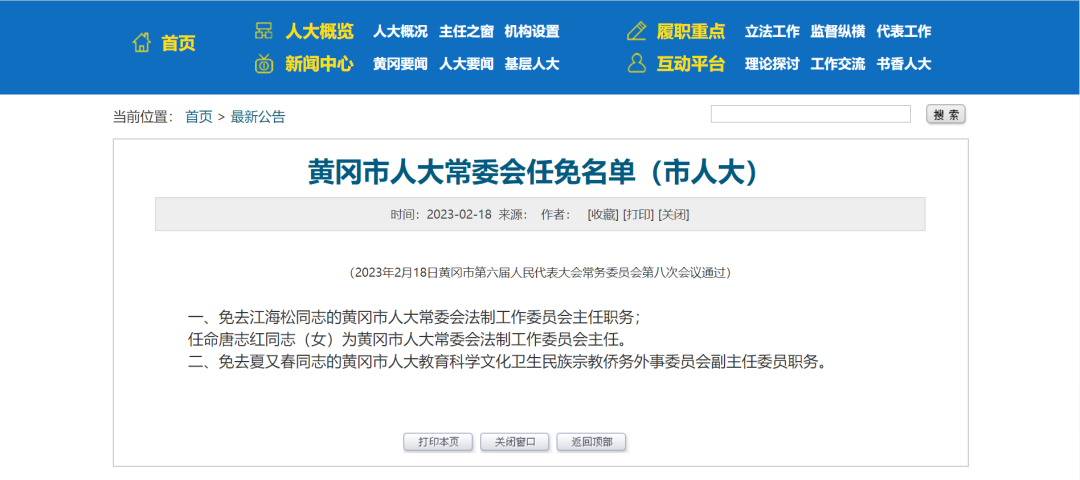 一、免去江海松同志的黄冈市人大常委会法制工作委员会主任职务;任命唐志红同志(女)为黄冈市人大常委会法制工作委员会主任。